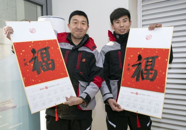 2024年1月16日,在北京的中国职工之家工会驿站举行的万福迎春——2024年“送万福、进万家”书法公益活动上,快递小哥展示福字。