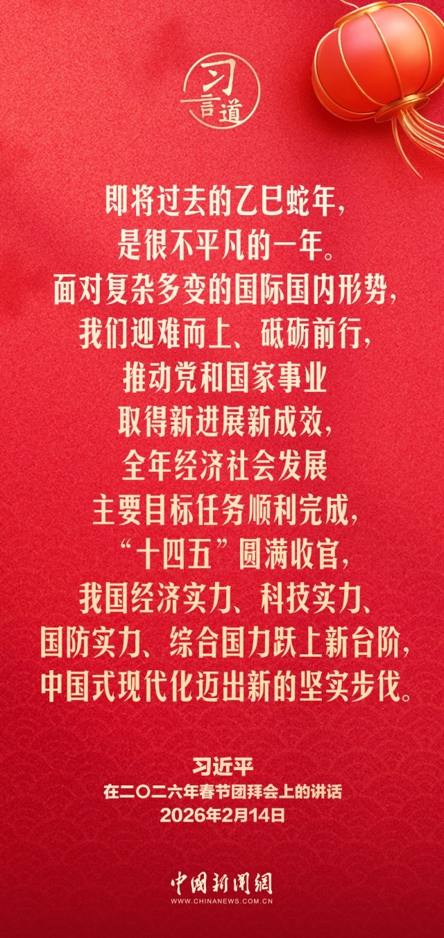 2月14日,中共中央、国务院在人民大会堂举行2026年春节团拜会。中共中央总书记、国家主席、中央军委主席习近平发表讲话,代表党中央和国务院,向全国各族人民,向香港特别行政区同胞、澳门特别行政区同胞、台湾同胞和海外侨胞拜年。他指出——