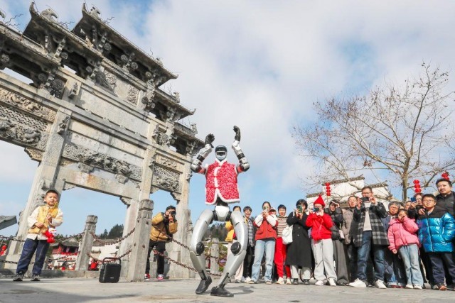 △2026年2月18日,游客在安徽黟县西递古村观看机器人表演。
