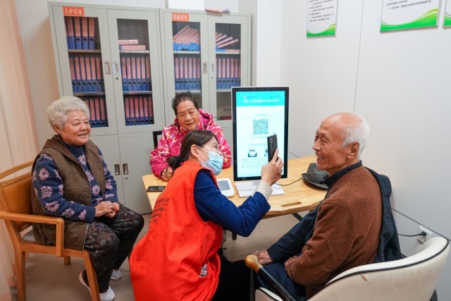 2025年10月23日,老人在山东省淄博市张店区马尚街道金石社区日间护理中心测量健康数据。新华社记者 朱峥 摄