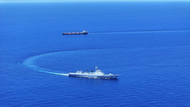 中国海军第46批护航编队焦作舰(下)护送货船至解护点后与之分航(2024年5月7日摄)。新华社发(张大禹 摄)