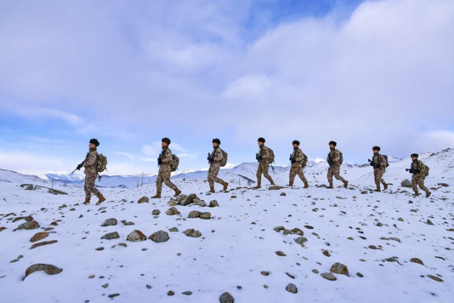2024年2月9日,驻守帕米尔高原的新疆军区某边防团红其拉甫边防连官兵踏雪巡逻。新华社发(姬文志 摄)