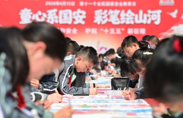 2026年4月10日,在江西省赣州市白云小学,学生们在创作国家安全教育主题绘画。新华社发(胡江涛 摄)