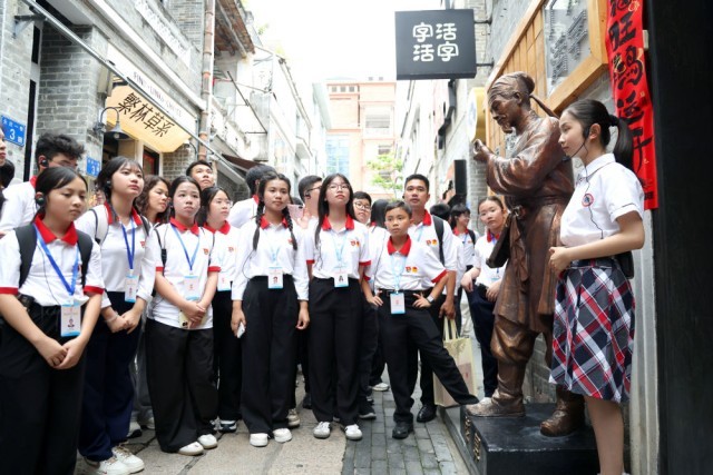 4月11日,越南青少年在广州永庆坊了解活字印刷相关知识。