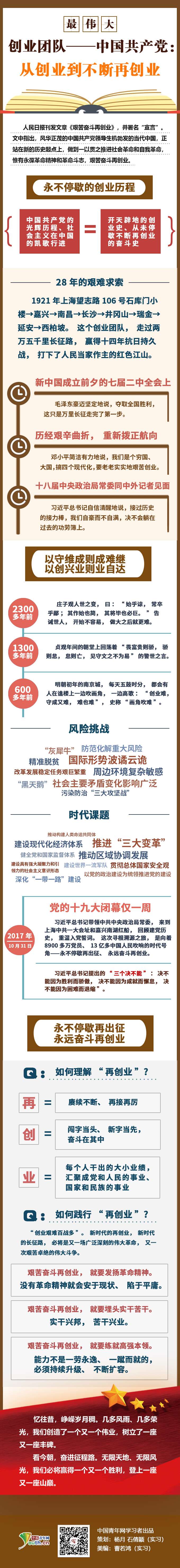 中国青年网北京2月26日电(记者 杨月 实习记者 石倩颖 曹若鸿)近日,人民日报刊发文章《艰苦奋斗再创业》,并署名“宣言”。文中指出,“中国共产党这个中国近代以来最伟大的创业团队”,1921年从上海的一座石库门小楼里集结出发,立下以马克思主义、共产主义挽救民族危亡的伟大志向,筚路蓝缕、风雨兼程,带领人民不断铸就民族复兴的伟大业绩。