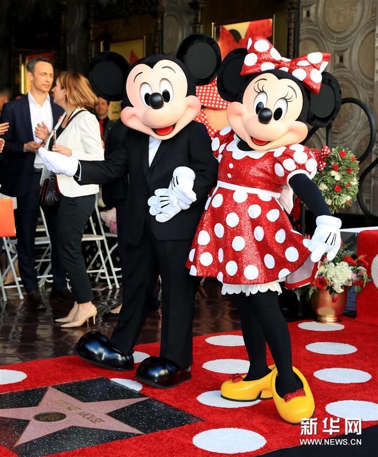 1月22日,在美国洛杉矶好莱坞,米妮(右)和米奇参加添星仪式。 迪士尼卡通角色米妮22日在好莱坞星光大道上留下属于自己的一颗星。新华社记者李颖摄