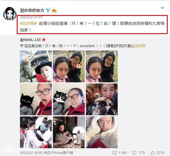 3月22日凌晨,刘亦菲助理在微博晒出老板私照及和老板合影澄清“六个助理”传闻,其配文“哼 宝宝身边就!只!有!我!一!个!assistant !!”粉丝纷纷评论“博主,是不是你一个人多吃了五人份的饭”“大概这个小姐姐吃了6份盒饭吧”。