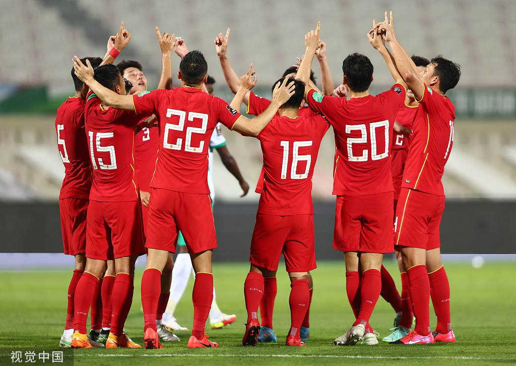 国足球员进球后双手指天。图片来源:视觉中国。