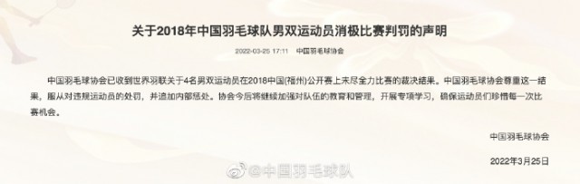 此后,中国羽毛球协会官方发布声明,“中国羽毛球协会已收到世界羽联关于4名男双运动员在2018中国(福州)公开赛上未尽全力比赛的裁决结果。”中国羽协表示,服从对违规运动员的处罚,并追加内部惩处。今后将继续加强对队伍的教育和管理,开展专项学习,确保运动员们珍惜每一次比赛机会。(完)