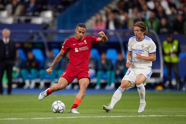 5月28日,皇家马德里队球员莫德里奇(右)与利物浦队球员蒂亚戈在比赛中拼抢。当日,皇家马德里队以1比0战胜英超利物浦队,获得队史第14座欧冠冠军奖杯。新华社记者孟鼎博摄