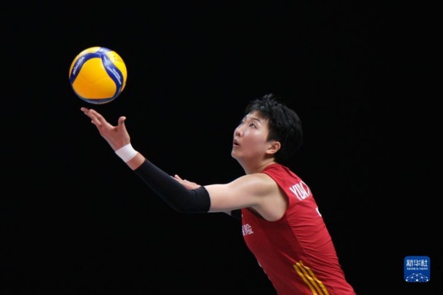 9月25日,中国队球员袁心玥在比赛中发球。新华社记者 孟鼎博 摄