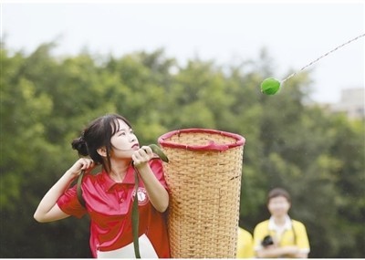 广西壮族自治区桂林理工大学南宁分校空港校区日前举办第二届少数民族传统体育运动会,旨在保护和发展少数民族传统文化,促进各民族大学生交往交流交融。图为参赛大学生在进行背篓绣球项目比赛。