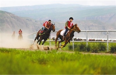 甘肃省张掖市肃南裕固族自治县皇城镇第十七届民族文化旅游艺术节暨传统体育运动会上,民族传统竞技赛马吸引了众多游客。