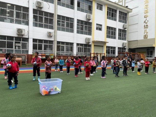 火烧店镇中心幼儿园的孩子们在做趣味足球操。
