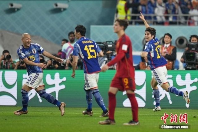 资料图:当地时间12月1日,2022卡塔尔世界杯E组最后一轮小组赛在哈里发国际体育场进行,日本队2-1胜西班牙队,以小组第一的成绩从“死亡之组”出线。图为日本队球员在进球后庆祝。 中新社记者 崔楠 摄