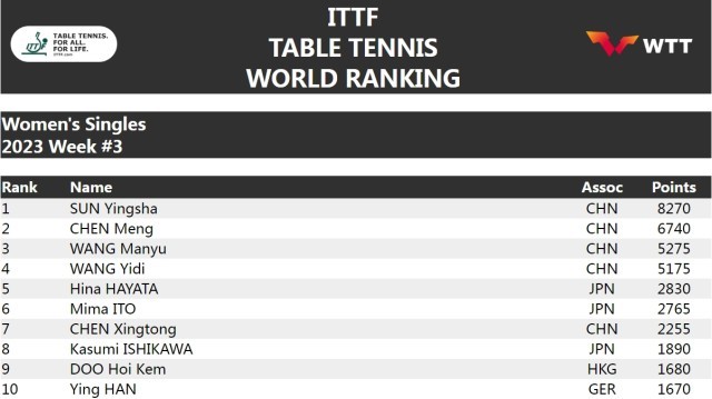 中新网1月17日电 17日,国际乒联更新了2023年第三周的世界排名。男单方面,樊振东、马龙、王楚钦继续排名前三位。女单方面,孙颖莎、陈梦、王曼昱、王艺迪稳居前四。