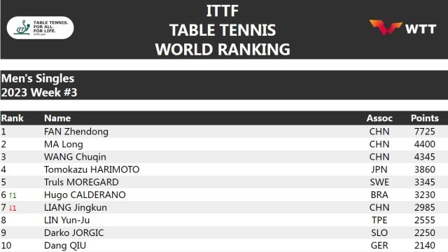 本次公布的排名中,梁靖崑较上一周期下降一位排名第七,林高远排名第十二。女单方面,陈幸同排名第七。在WTT常规挑战赛德班站比赛中发挥出色的范思琦和钱天一排名大幅上升,前者上升9位来到第18,后者上升20位排名第20。
