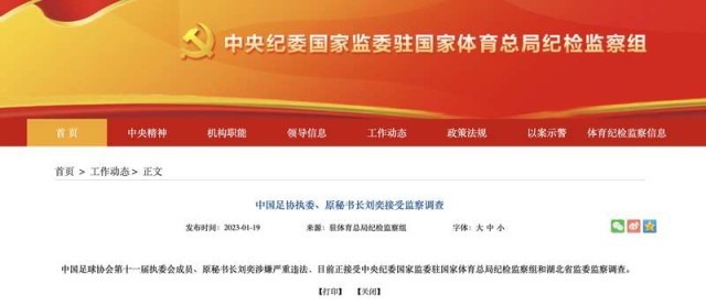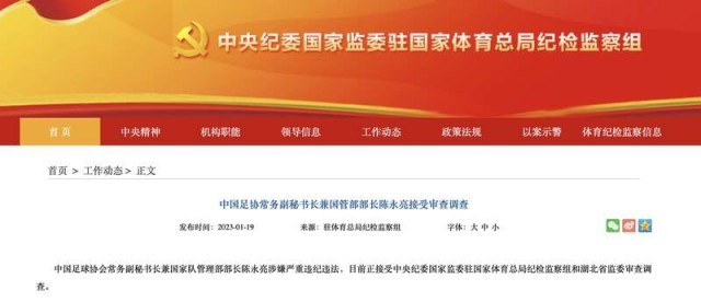 中央纪委国家监委驻国家体育总局纪检监察组网站刊文称,“中国足球协会第十一届执委会成员、原秘书长刘奕涉嫌严重违法,目前正接受中央纪委国家监委驻国家体育总局纪检监察组和湖北省监委监察调查”;“中国足球协会常务副秘书长兼国家队管理部部长陈永亮涉嫌严重违纪违法,目前正接受中央纪委国家监委驻国家体育总局纪检监察组和湖北省监委审查调查”。