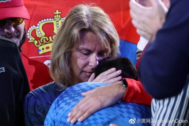 德约科维奇在母亲的怀里流泪。 图片来源:澳网官方社交媒体