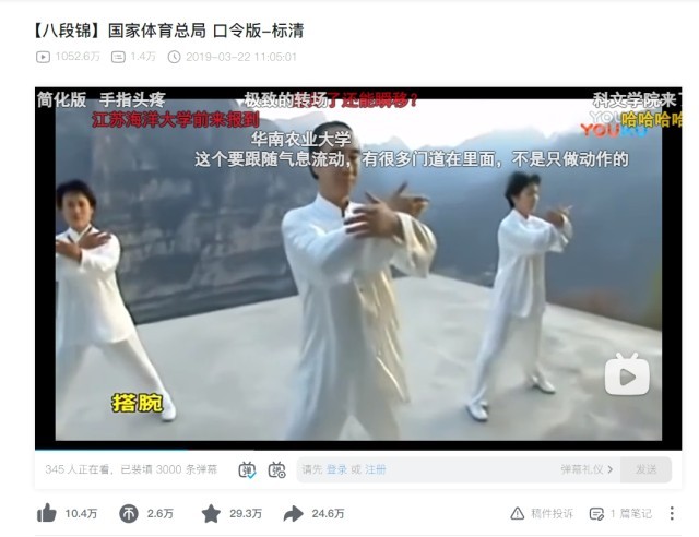 热度最高的是体育总局口令版八段锦教学,播放量超1052万。在上世纪八九十年代画质的视频下,洋洋洒洒近6000条评论,其中多是以大学生为代表的年轻人。相互之间,称彼此为“锦友”。