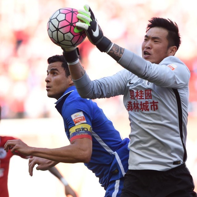 2016年5月7日,辽宁沈阳宏运队门将石笑天(右)在比赛中救球。新华社记者潘昱龙摄