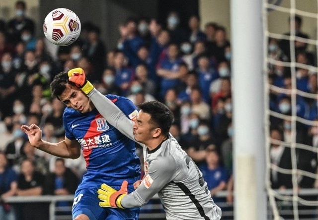 2021年5月17日,长春亚泰队守门员石笑天(右)在比赛中扑救。新华社记者朱峥摄