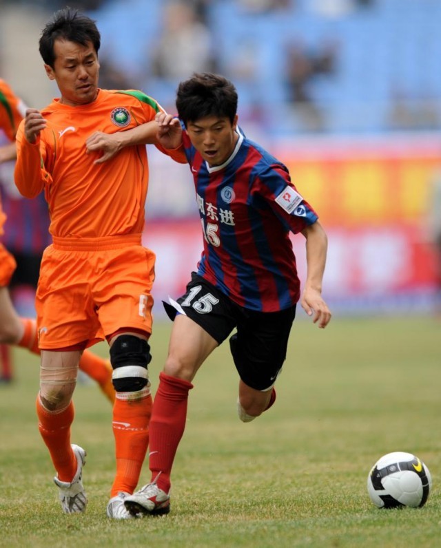 2009年4月11日,沈阳东进队球员李根(右)在比赛中进攻。新华社记者李钢摄