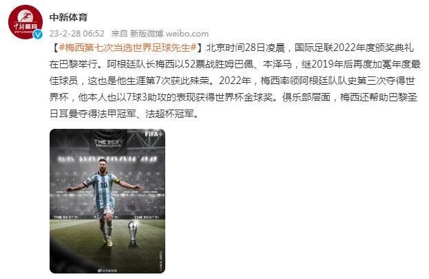 北京时间28日凌晨,国际足联2022年度颁奖典礼在巴黎举行。阿根廷队长梅西以52票战胜姆巴佩、本泽马,继2019年后再度加冕年度最佳球员,这也是他生涯第7次获此殊荣。2022年,梅西率领阿根廷队队史第三次夺得世界杯,他本人也以7球3助攻的表现获得世界杯金球奖。俱乐部层面,梅西还帮助巴黎圣日耳曼夺得法甲冠军、法超杯冠军。