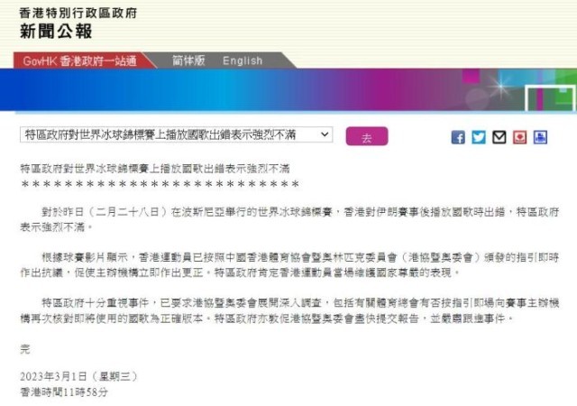 中新网3月1日电 据香港特区政府新闻公报消息,对于2月28日在波黑举行的世界冰球锦标赛上,中国香港男子冰球代表队出战伊朗时播放国歌出错一事,香港特区政府表示强烈不满。