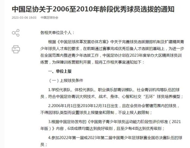 中新网3月7日电 中国足球协会日前在网站发布关于2006至2010年龄段优秀球员选拔的通知。其中提到,为进一步在全国范围内推进青少年选拔工作,中国足协计划在2023年度举办大区精英球员训练营,选拔方式包括单位上报和个人自荐两种。