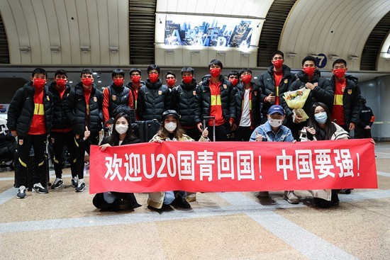3月16日凌晨,U20国青回国,球迷难得在机场展开横幅迎接球队。视觉中国供图