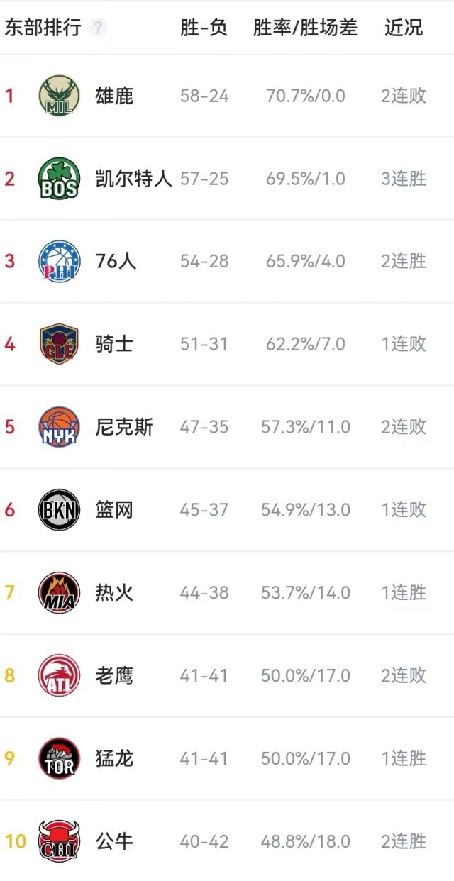 在东部,雄鹿(58胜24负)、凯尔特人(57胜25负)、76人(54胜28负)、骑士(51胜31负)、尼克斯(47胜35负)和篮网(45胜37负)分列东部前6。