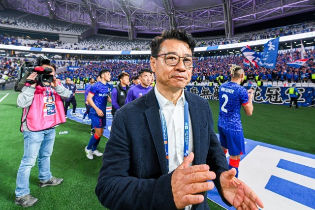 穿着一身黑色西装外套,头上抹了一些发蜡,很久没有看到上海申花主帅吴金贵如此正式着装指挥比赛了。