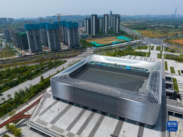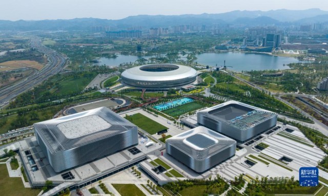 这是2021年8月23日拍摄的凤凰山体育公园专业足球场和综合体育馆(右),成都大运会篮球项目的比赛将在综合体育馆举行。新华社发(成都大运会执委会供图)