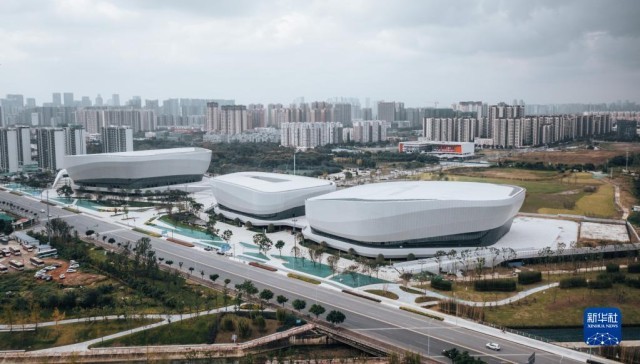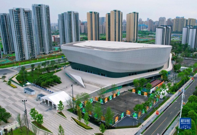 这是2023年4月18日拍摄的东安湖体育公园游泳跳水馆,成都大运会游泳项目的比赛将在这里举行。新华社记者 沈伯韩 摄