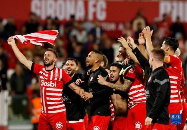 4月25日,赫罗纳队球员赛后庆祝胜利。新华社/路透