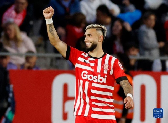 4月25日,赫罗纳队球员卡斯特利亚诺斯在比赛中打进球队第三粒进球后庆祝。新华社/路透
