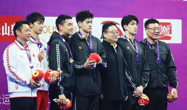 以浙江队为例,教练员间的“换血”非常顺畅,不少昔日的同组兄弟成为师徒。42岁的郑坤良因频繁陪同队员登上冠军领奖台,被戏称为“冠军吉祥物”,他的两大弟子潘展乐和费立纬包揽了从男子100米到1500米的五个自由泳项目金牌;当潘展乐和费立纬同场竞技400米自由泳、分别登上冠军和季军领奖台时,他请出了在国家队“三合一战队”抱团训练的汪海波教练陪同费立纬领奖。