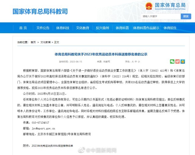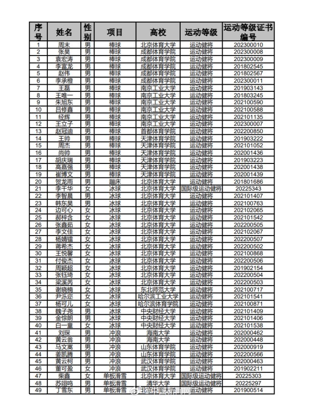 6月15日,国家体育总局科教司发布关于2023年优秀运动员本科保送推荐名单的公示,公示时间为2023年6月15日至21日。名单显示,单板滑雪运动员苏翊鸣保送推荐清华大学。