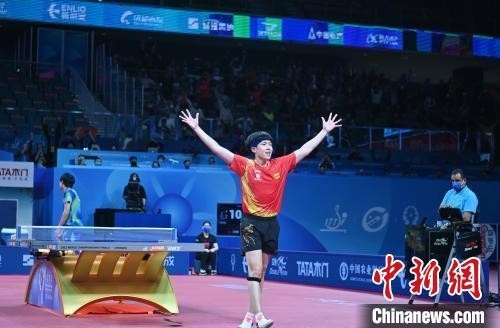 10月8日,四川成都,2022年第56届国际乒联世界乒乓球团体锦标赛(决赛)·成都迎来第九个比赛日。中国男团3:2胜日本晋级决赛。图为中国乒乓球队员王楚钦比赛后欢呼胜利。 中新社记者 安源 摄