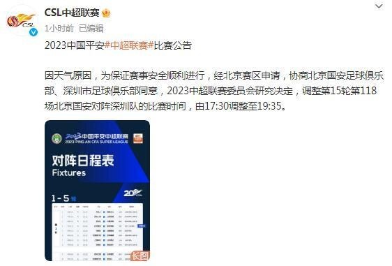 因天气原因,为保证赛事安全顺利进行,经北京赛区申请,协商北京国安足球俱乐部、深圳市足球俱乐部同意,2023中超联赛委员会研究决定,调整第15轮第118场北京国安对阵深圳队的比赛时间,由17:30调整至19:35。