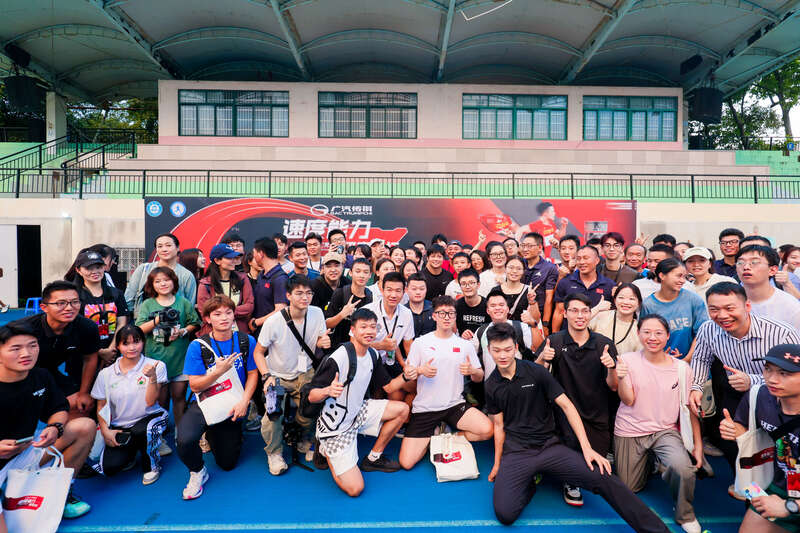 苏炳添和参与短跑实操工作坊的同学合影。受访者供图