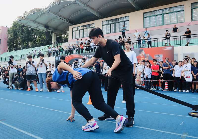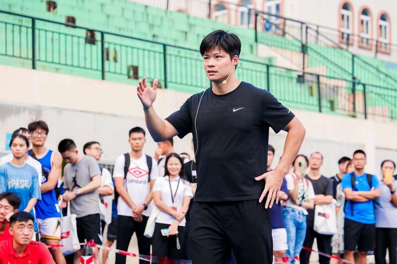 当天下午,苏炳添在暨南大学石牌校区旭日田径场开展短跑实操工作坊,现场讲解跨步跳、雪橇跑、蹬起跑器等训练动作的要领、功能及注意事项,邀请暨南大学体育学院青年教师、国家健将级田径运动员莫有雪演示动作,并指导学生如何综合运用这些训练提升加速跑能力。苏炳添建议学子做好训练记录,他表示自己从2010年开始就对自身训练量和训练频次进行记录,建立数据模型来对比分析。