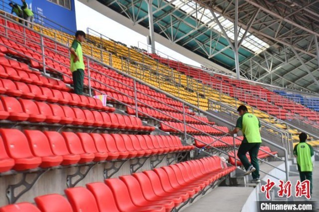 工作人员正在对观众席做清洁工作。 张浪 摄
