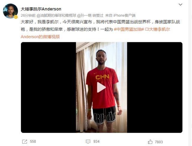 随后,李凯尔在个人社交媒体发布视频,透露自己将代表中国男篮出战世界杯。他写道:“今天很高兴宣布,我将代表中国男篮出战世界杯,身披国家队战袍,是我的骄傲和荣幸,感谢球迷的支持!一起为中国男篮加油。”
