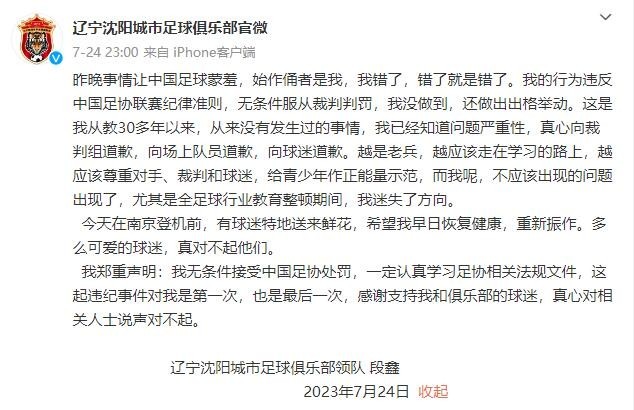在7月24日的道歉声明中,段鑫表示,“我的行为违反中国足协联赛纪律准则,无条件服从裁判判罚,我没做到,还做出出格举动。这是我从教30多年以来,从来没有发生过的事情,我已经知道问题严重性,真心向裁判组道歉,向场上队员道歉,向球迷道歉。越是老兵,越应该走在学习的路上,越应该尊重对手、裁判和球迷,给青少年作正能量示范,而我呢,不应该出现的问题出现了,尤其是全足球行业教育整顿期间,我迷失了方向。”