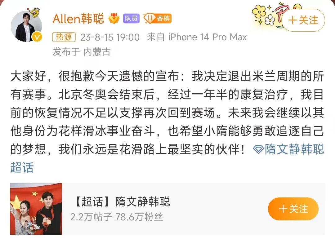 “未来我会继续以其他身份为花样滑冰事业奋斗”,韩聪写道。
