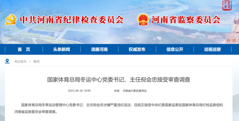 中国青年报客户端北京8月26日电(中青报·中青网记者 慈鑫)据河南省纪委监委网站今天上午消息,国家体育总局冬季运动管理中心党委书记、主任倪会忠涉嫌严重违纪违法,目前正接受中央纪委国家监委驻国家体育总局纪检监察组和河南省监察委员会审查调查。