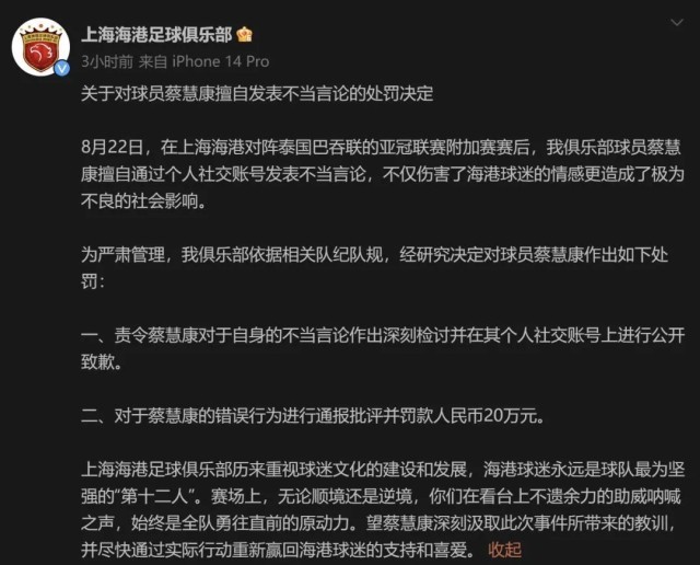 重重风波之下,直到本轮1:3不敌河南队之后,上海海港才发布公告,对蔡慧康罚款20万,并责令作出深刻检讨、在社交媒体上公开道歉。