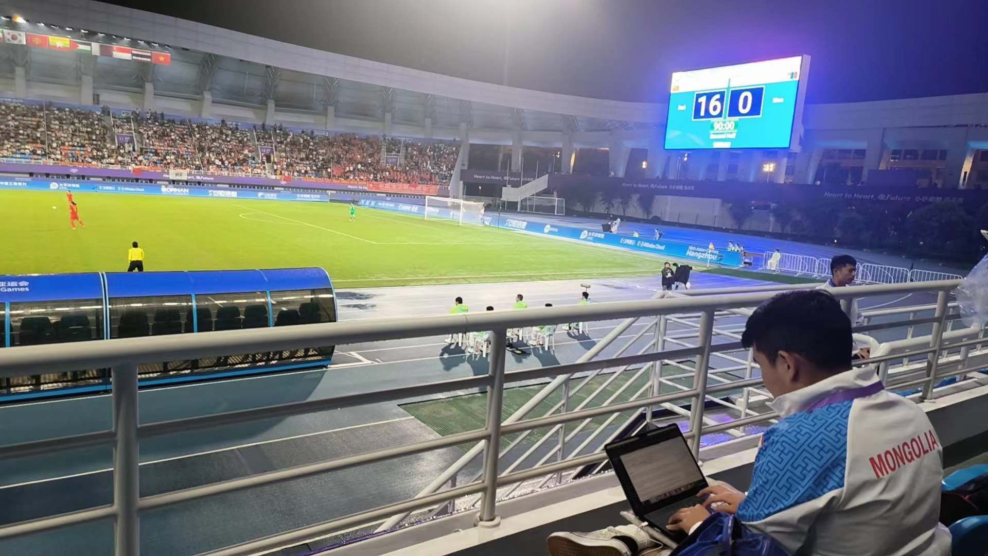 中国青年报客户端杭州9月22日电(中青报·中青网记者 郭剑文/摄)今晚在临平体育中心亮相的中国女足用尊重比赛的方式创下本届亚运会足球赛事单场进球记录:半场8:0、全场16:0大胜2015年建队、首次参加亚运会的蒙古女足。座无虚席的球场内不断翻滚的“人浪”,让这场开门红喜气洋洋。